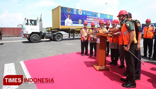 TIMES Nunukan/Gubernur Jawa Timur. Dra. Hj. Khofifah Indar Parawansa saat melepas ekspor komoditi pertanian di Terminal PetikEmas Surabaya (TPS). Kamis (21/3/2019). (FOTO: TIM Media For TIMES Indonesia)