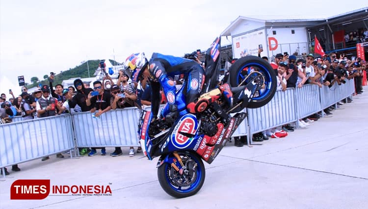 TIMES Nunukan/Pembalap PATA Yamaha Brixx Toprak Razgatlioglu melakukan atraksi stopie ban depan usai memenangi race 1 WSBK Mandalika 2022, Sabtu (12/11/2022). (FOTO: Tria Adha/TIMES Indonesia).