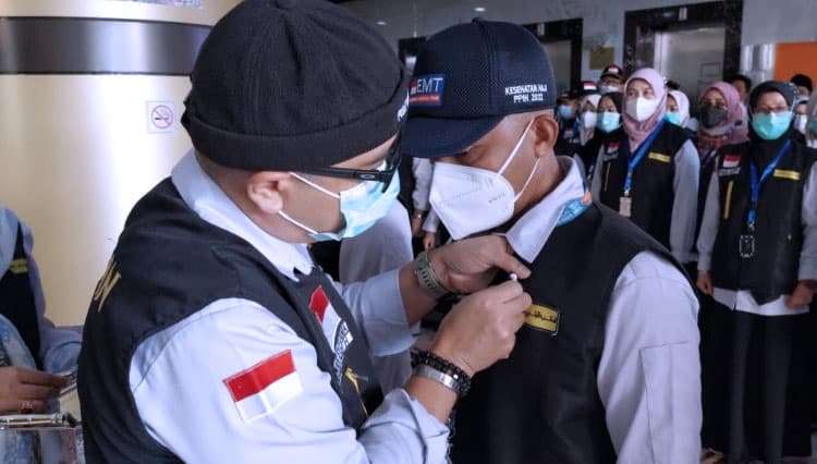 TIMES Nunukan/Kapuskes Haji Kemenkes Budi Sylvana saat menyematkan pin kepada petugas kesehatan haji. (FOTO: dok. Kemenkes)